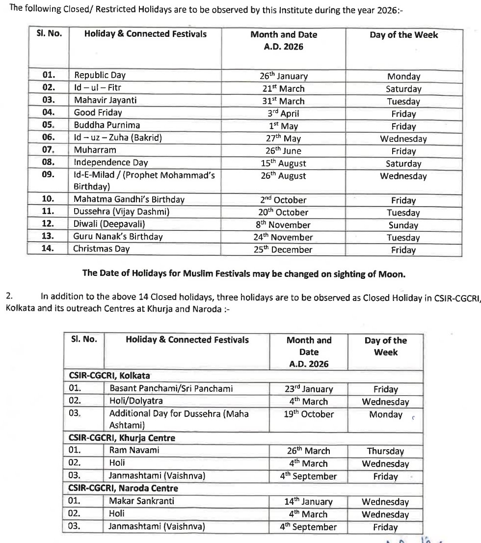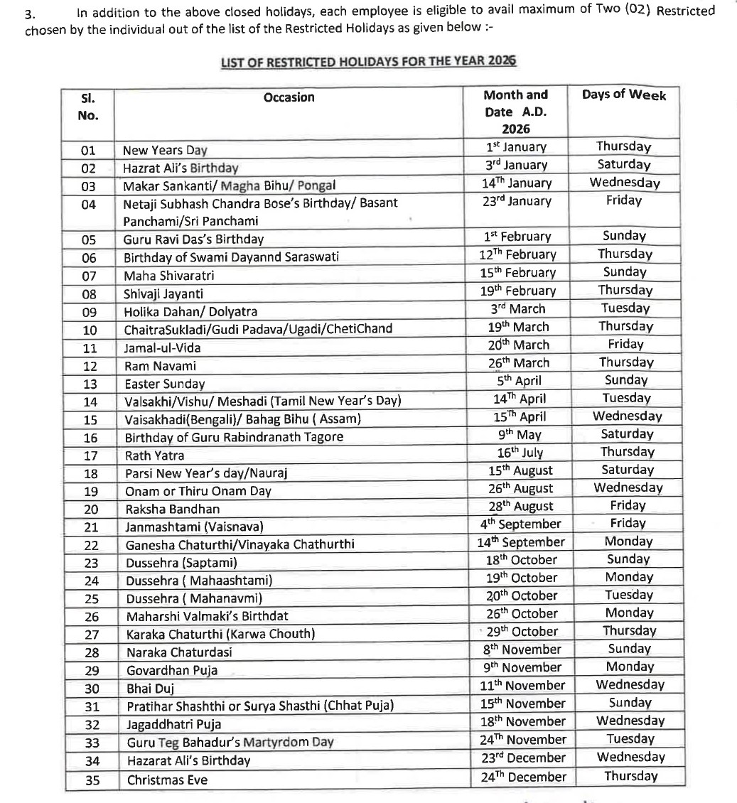 Holiday List for the year 2026